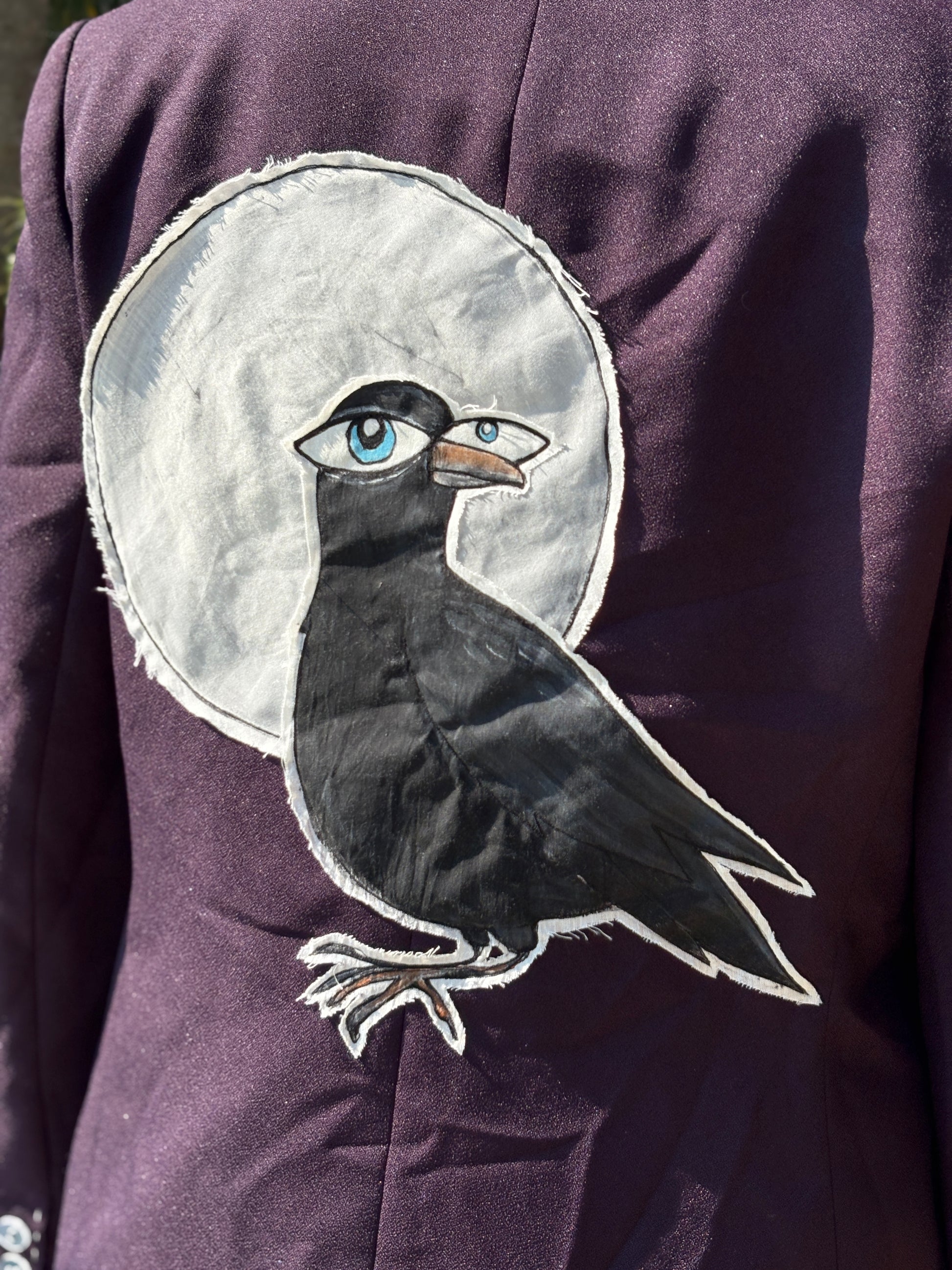 "On a Dead of Night" One of a Kind UpCycled Purple Blazer with Hand Painted Appliqué of Moon and Black Crow. Hand Stitching around Lapel, Pockets, and Sleeves