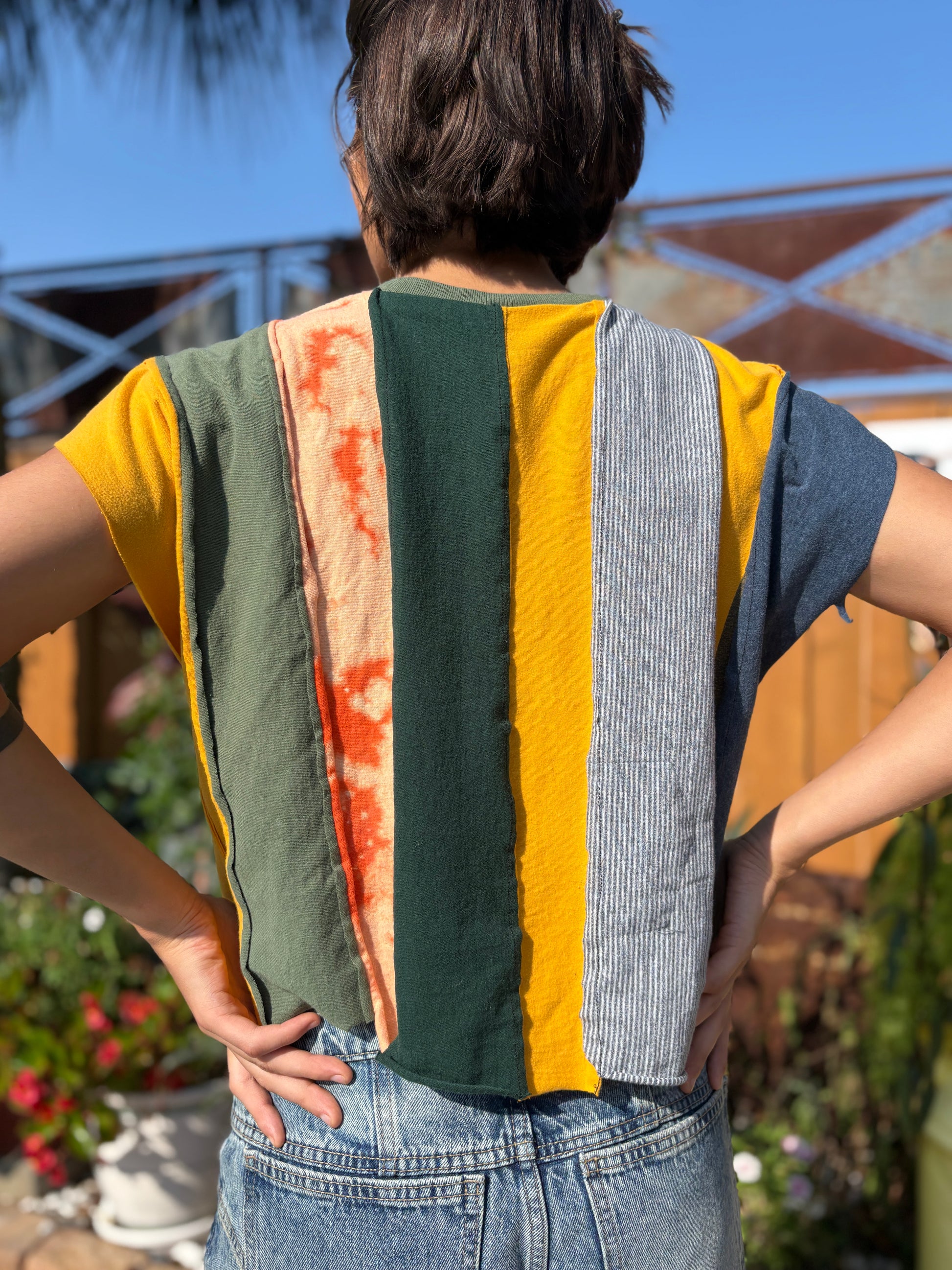 "STRIP TEE SHIRT" with Olive Green Collar. This Top I Made from Strips of ReCycled T-Shirts to Create this One of a Kind Original.
